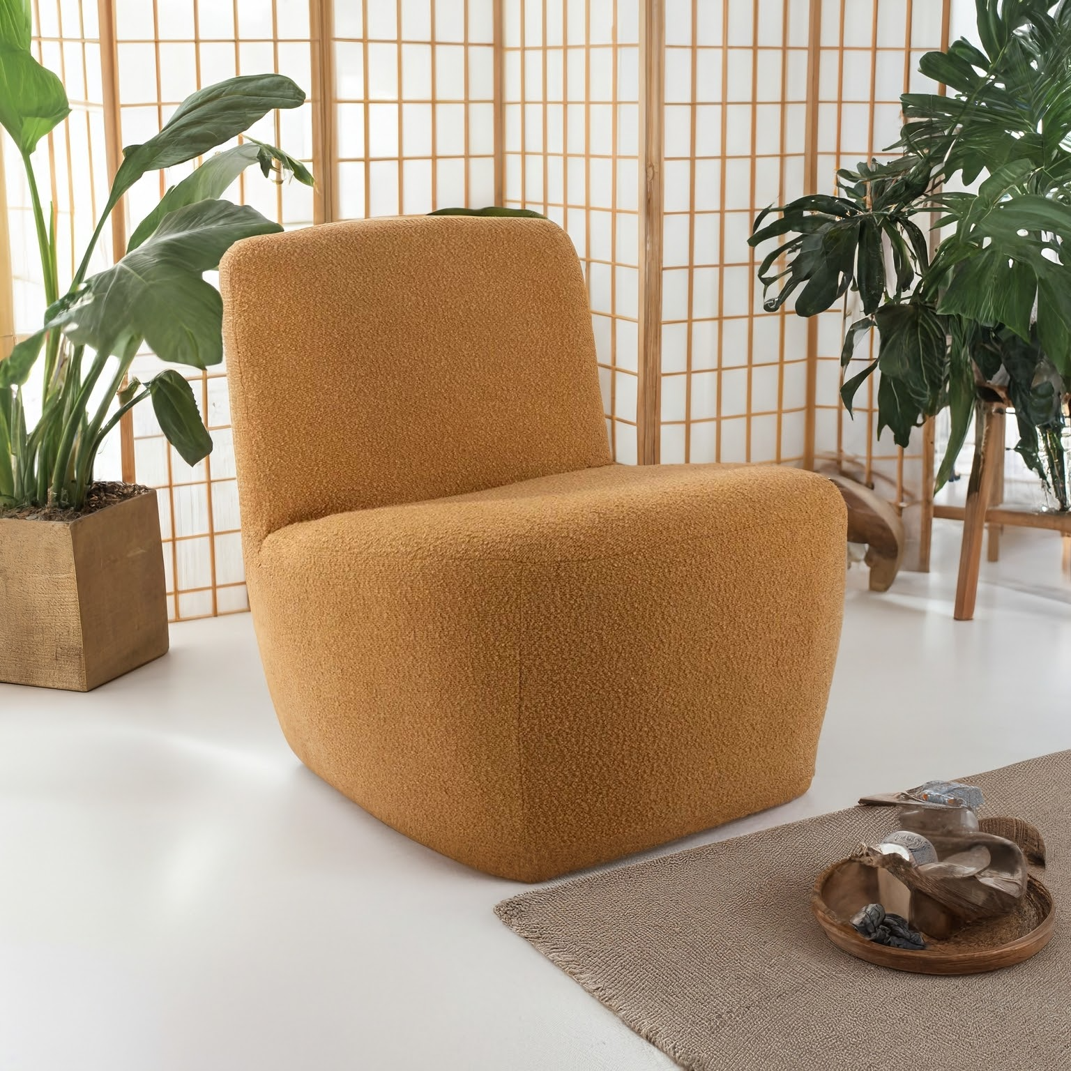 With its vibrant yellow bouclé fabric, the Ada chair adds an instant touch of energy and personality to your interior. The soft, textured upholstery feels luxurious, while the bold color makes it a true eye-catcher. Designed to combine coziness with playful elegance, it is ideal for living rooms that embrace warmth and character.